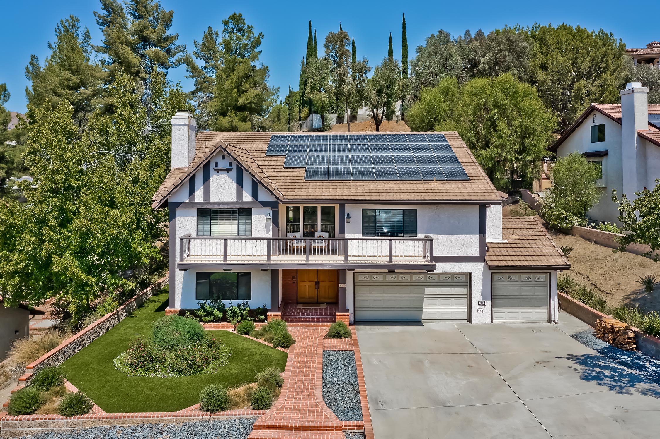 Sweeping hillside views! Located within Granada Hills Charter High School District on a fantastic cul-de-sac. This 5 bedroom and 3 bath home with abundant light features a stunning double door entrance with a two story formal staircase to the living room with vaulted ceilings and lovely balcony with mountain and valley views. A spacious dining area opens to an entertainer’s kitchen/breakfast room w/double ovens, an island and windows and sliders to the large yard with a covered patio. Built-in shelving and cabinets in living room and hallway, newly installed solar panels and updated landscaping are only a few of the recent upgrades. The downstairs bedroom suite is an ideal home office, playroom or second master! Additional storage and the three-car garage completes this beautiful home.